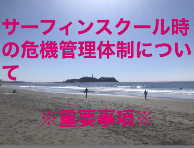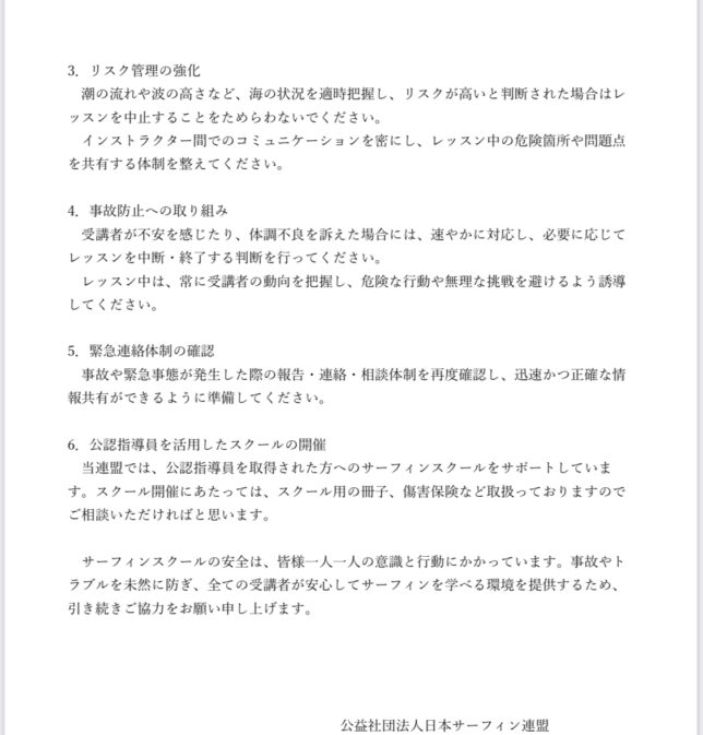 既に各支部におかれましては、地域に合わせたスクールの体制づくりや、注意喚起をおこなって頂いていることと思いますが、改めて サーフィンスクールの安全な運営を確保するため、以下の通り危機管理体制をご確認いただ き、徹底した対応をお願い申し上げます。