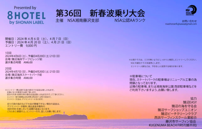 2024年4月6日(土)、予備日4月20日(土)21日(日)会場:鵠沼海岸サーフビレッジ前