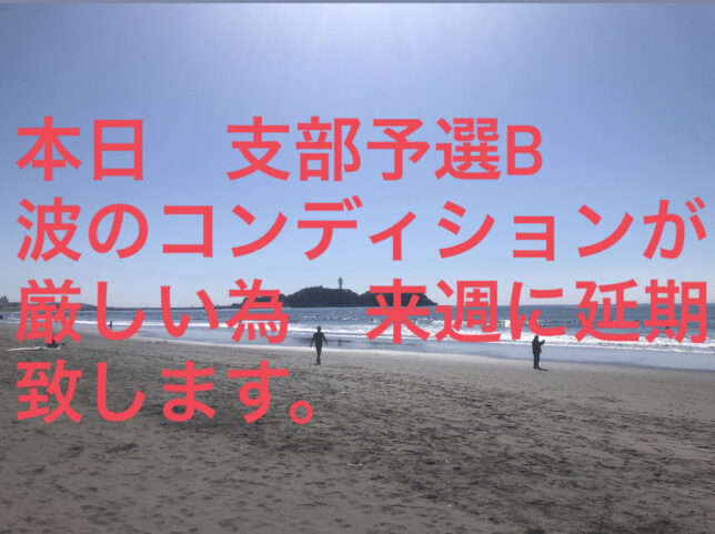 支部予選B 来週に延期になります。 2024年5月25日 / 2017shonan_fujisawa / コメントする おはよう御座います。 本日 予定されていた支部予選Bは波のコンディションが厳しい為 来週 6月1日(土) に延期致します。 朝早くからお越し下さった方々大変申し訳ございません。 何卒宜しくお願いします。