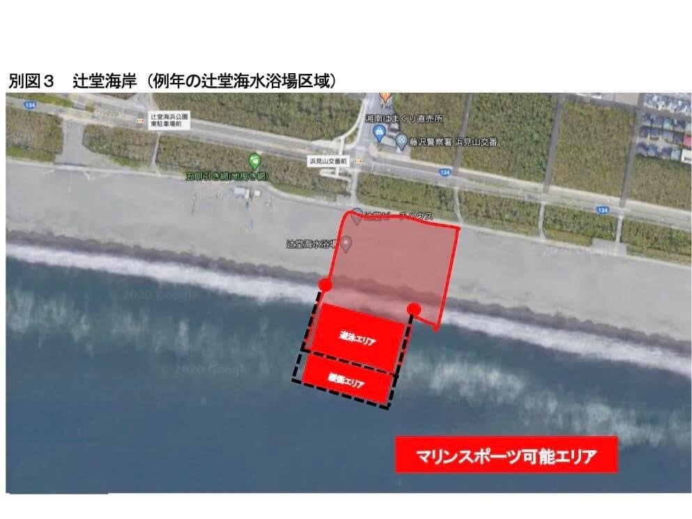 例年の辻堂海水浴場区域が遊泳エリアとなります。