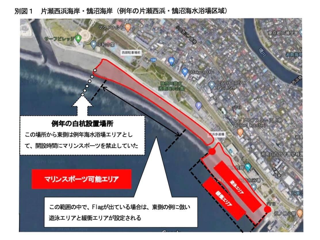 例年の白杭設置場所から片瀬漁港までの区域を海水浴場としていましたが、今年に限り新江ノ島水族館西側から片瀬漁港までを遊泳可能エリア、新江ノ島水族館西側から引地川河口まではマリンスポーツ可能エリアとなります。エリア内に於いても状況に応じて遊泳エリアを設定します。遊泳エリアでのマリンスポーツは朝夕、時間に関わらず終日ご遠慮ください。